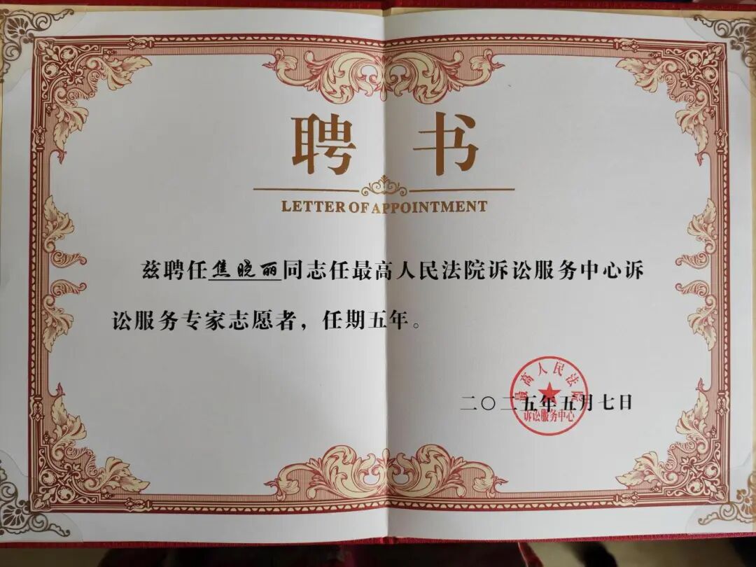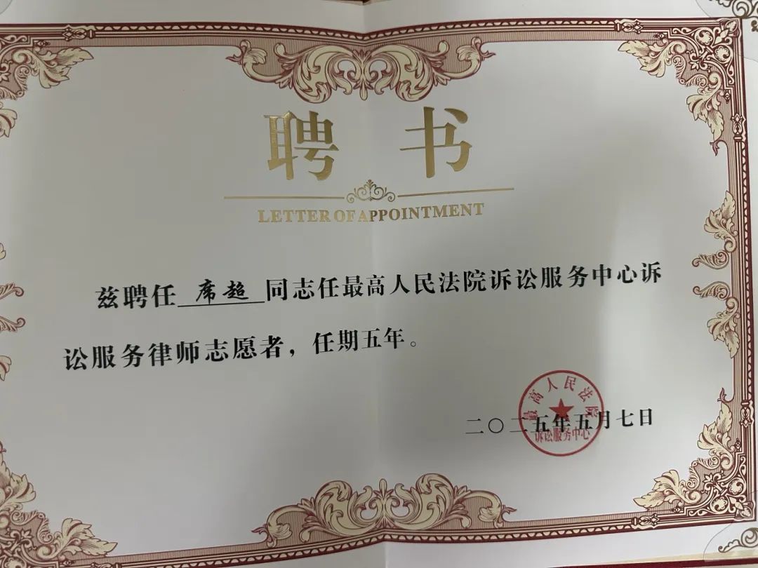 表彰荣誉:最高人民法院诉讼服务专家志愿者